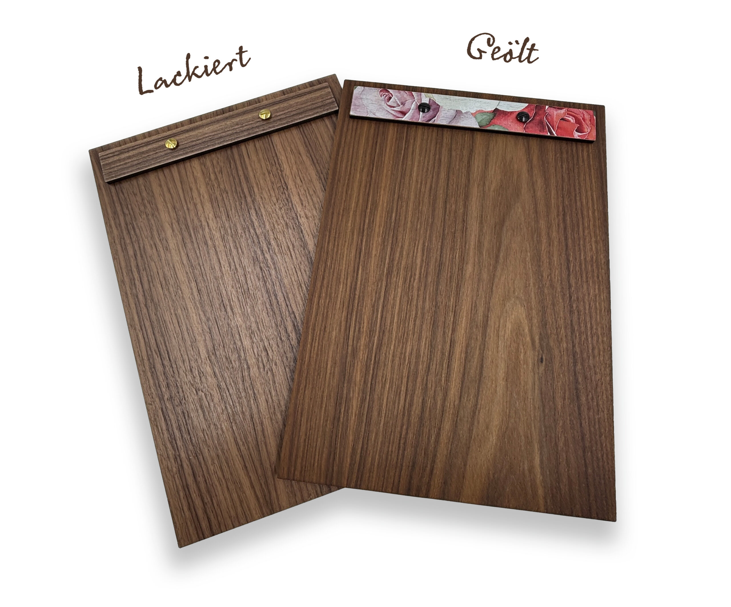 Bei einer Versiegelung mit Klarlack, sind die Klemmbretter desinfizierbar und fühlen sich glatt an.